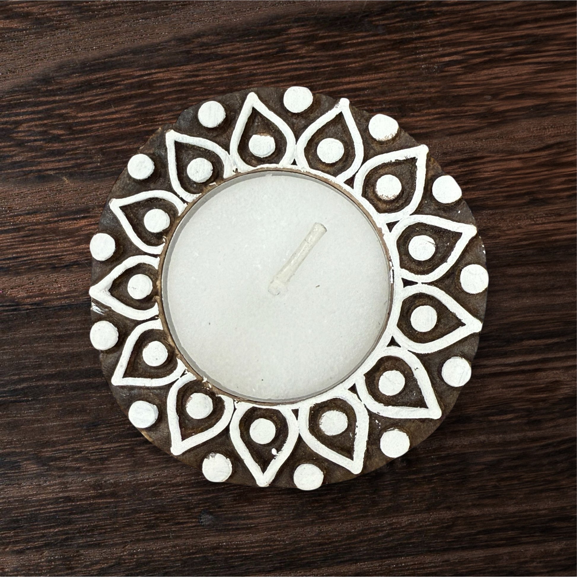 Handcrafted marigold-shaped wooden diya with mandala engraving. Eco-friendly, heat-safe, and perfect for festive décor, pooja rituals, meditation corners, and gifting. Buy handcrafted wooden diyas from GRUHAM.
