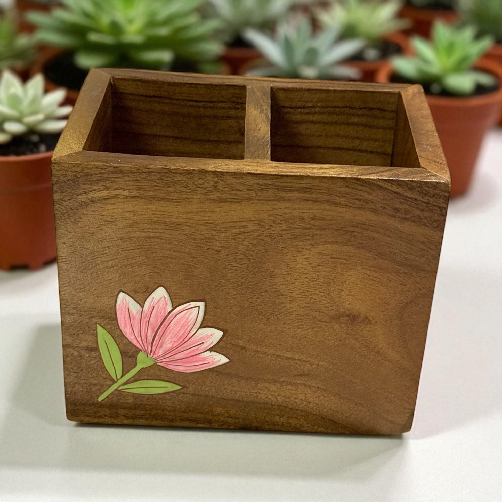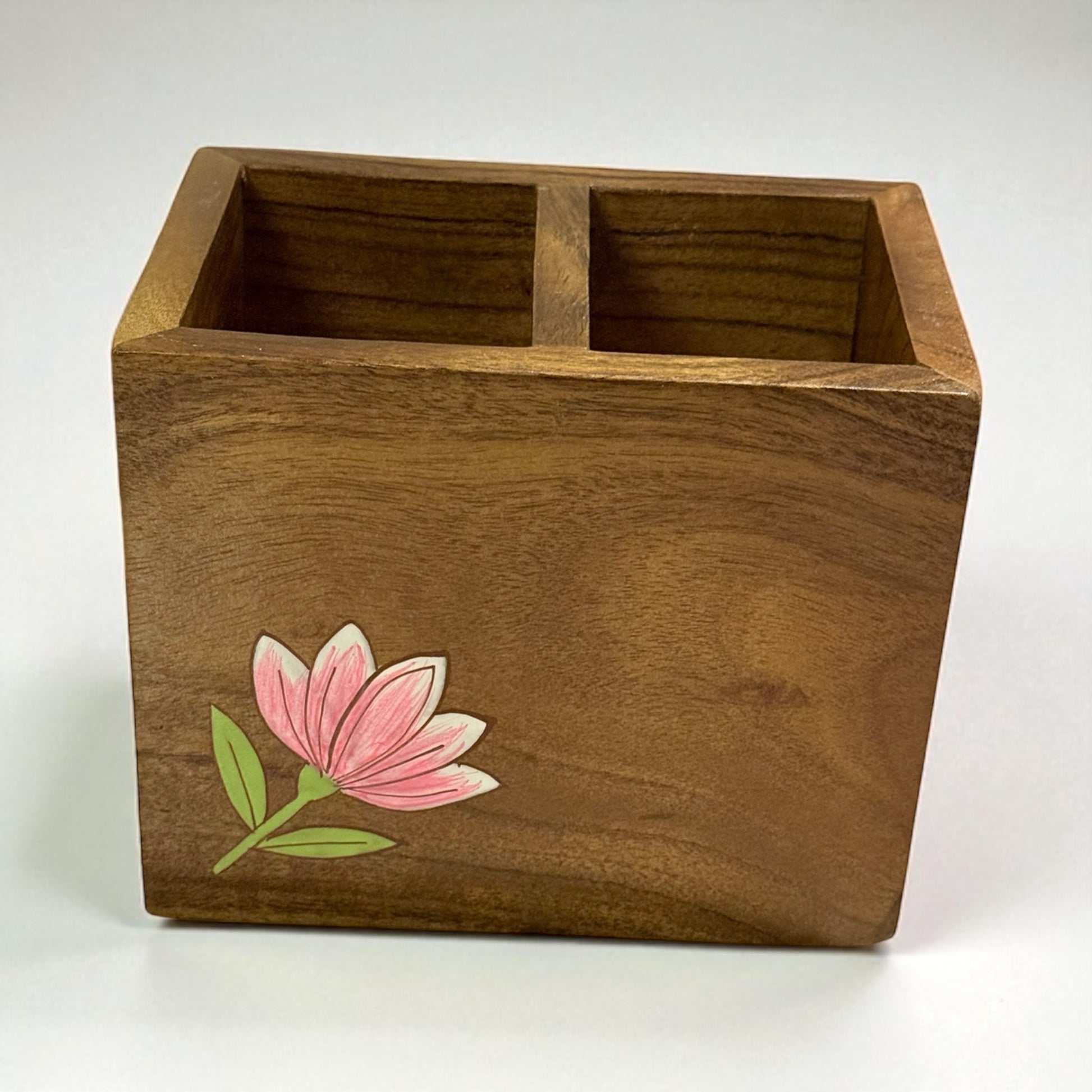 Organize with elegance using the Padma Lotus Cutlery Holder. Handcrafted from eco-friendly wood and adorned with a graceful hand-painted pink lotus, this holder brings functional beauty to your dining table or kitchen.