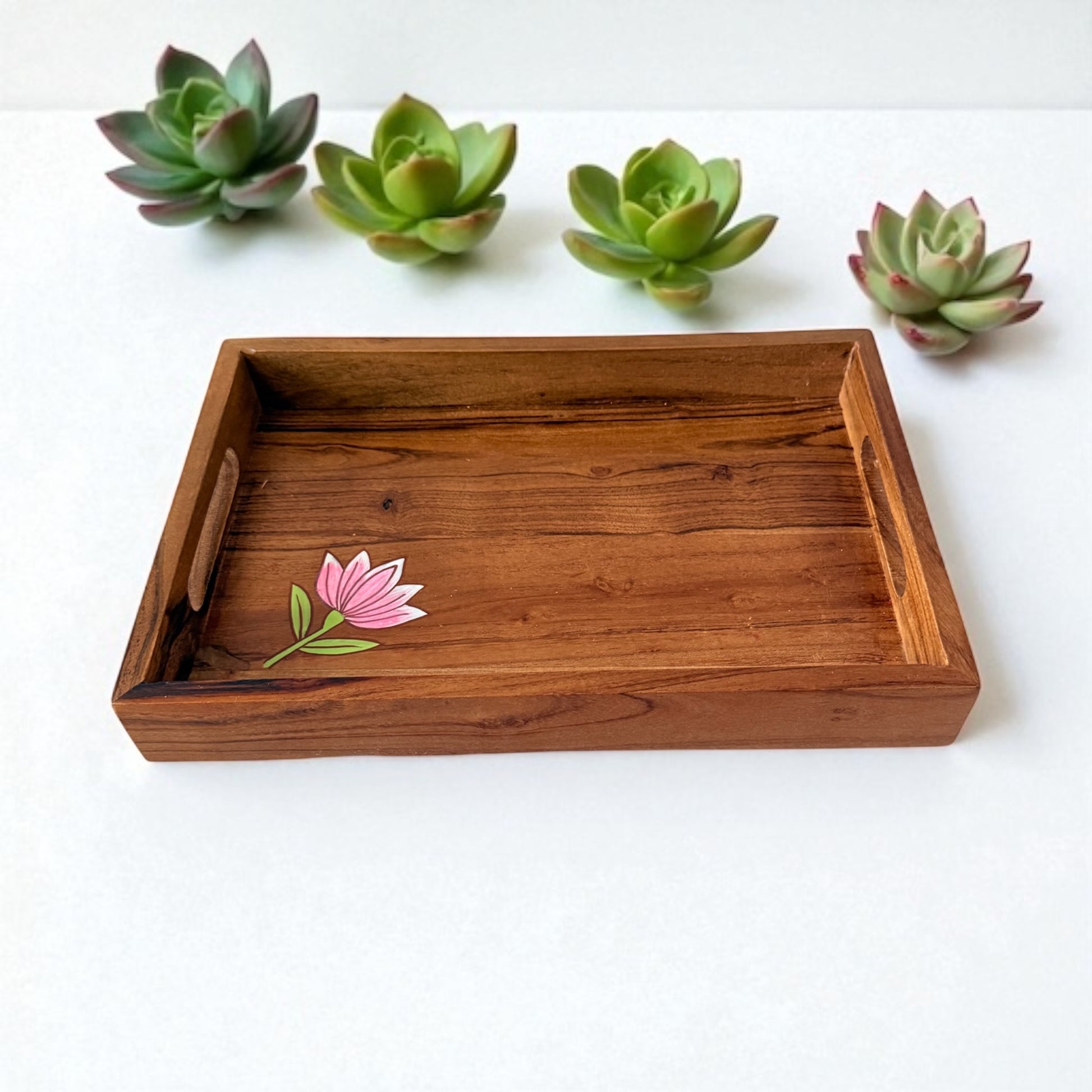 Serve with elegance and tradition using the Padma Lotus Serving Tray – Medium. Handcrafted from durable wood and adorned with a hand-painted pink lotus, this tray is perfect for serving snacks, beverages, or as a decorative base for your table settings.