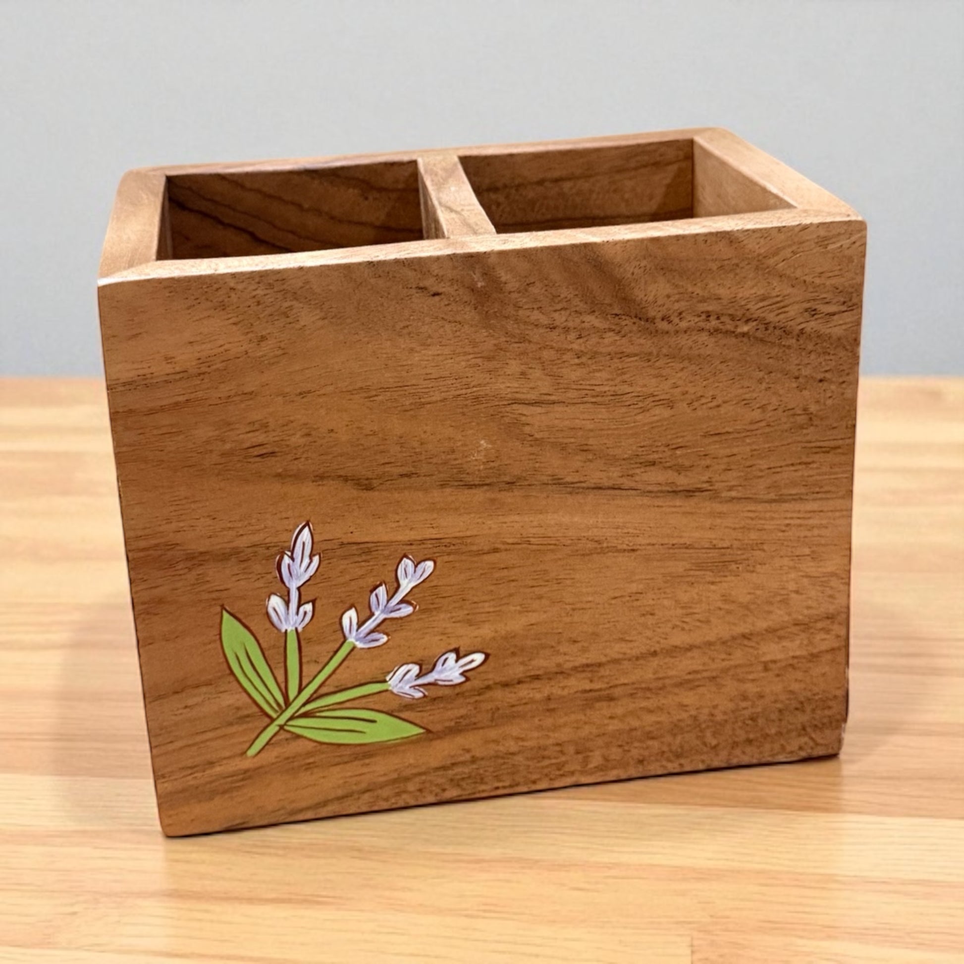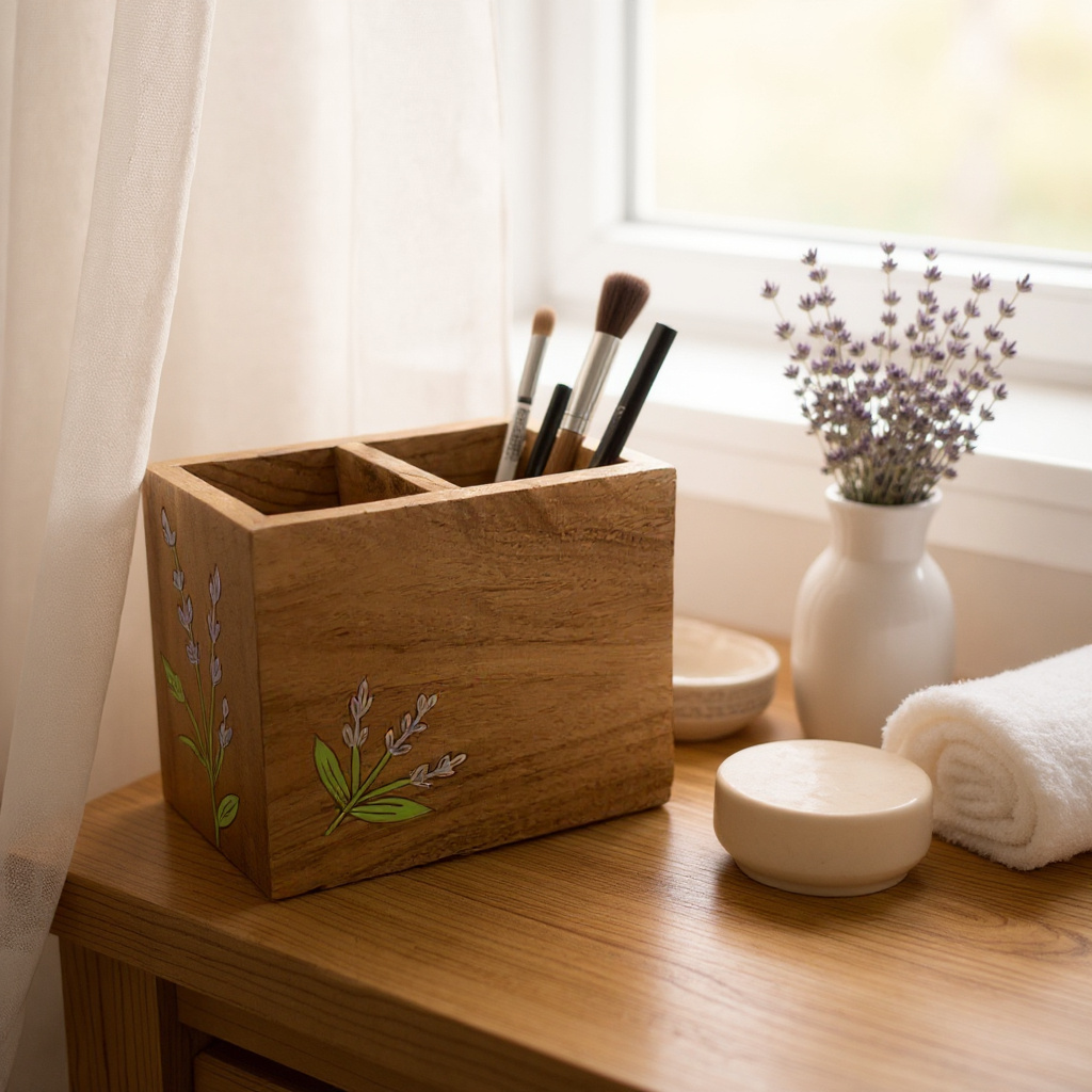 Keep your desk neat and stylish with the Tulip Bloom Wooden Pen Stand. Handcrafted in acacia wood with a smooth, food-safe finish, this organizer is perfect for holding pens, pencils, cutlery, or even makeup brushes. A versatile, artisan-made accessory for home or office.