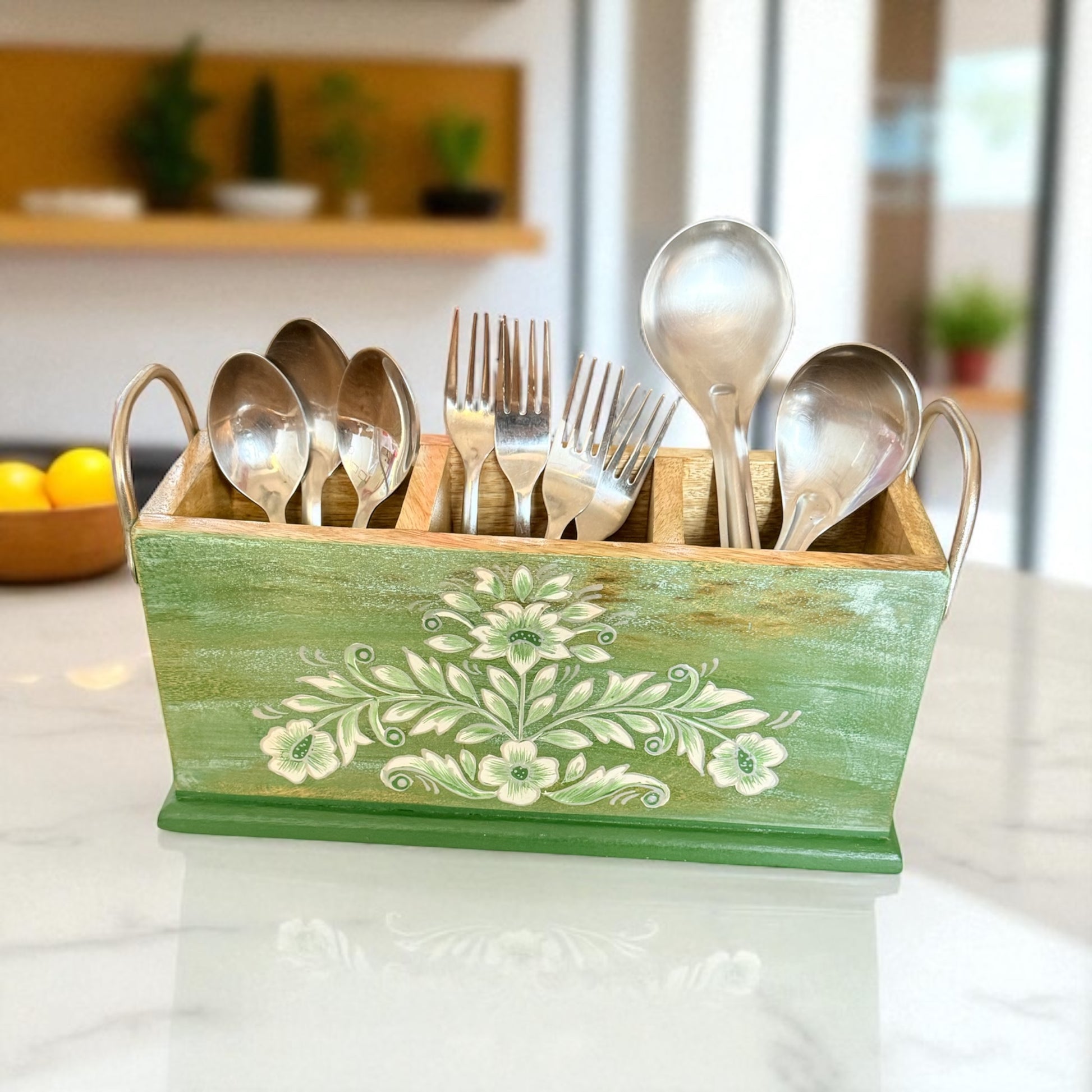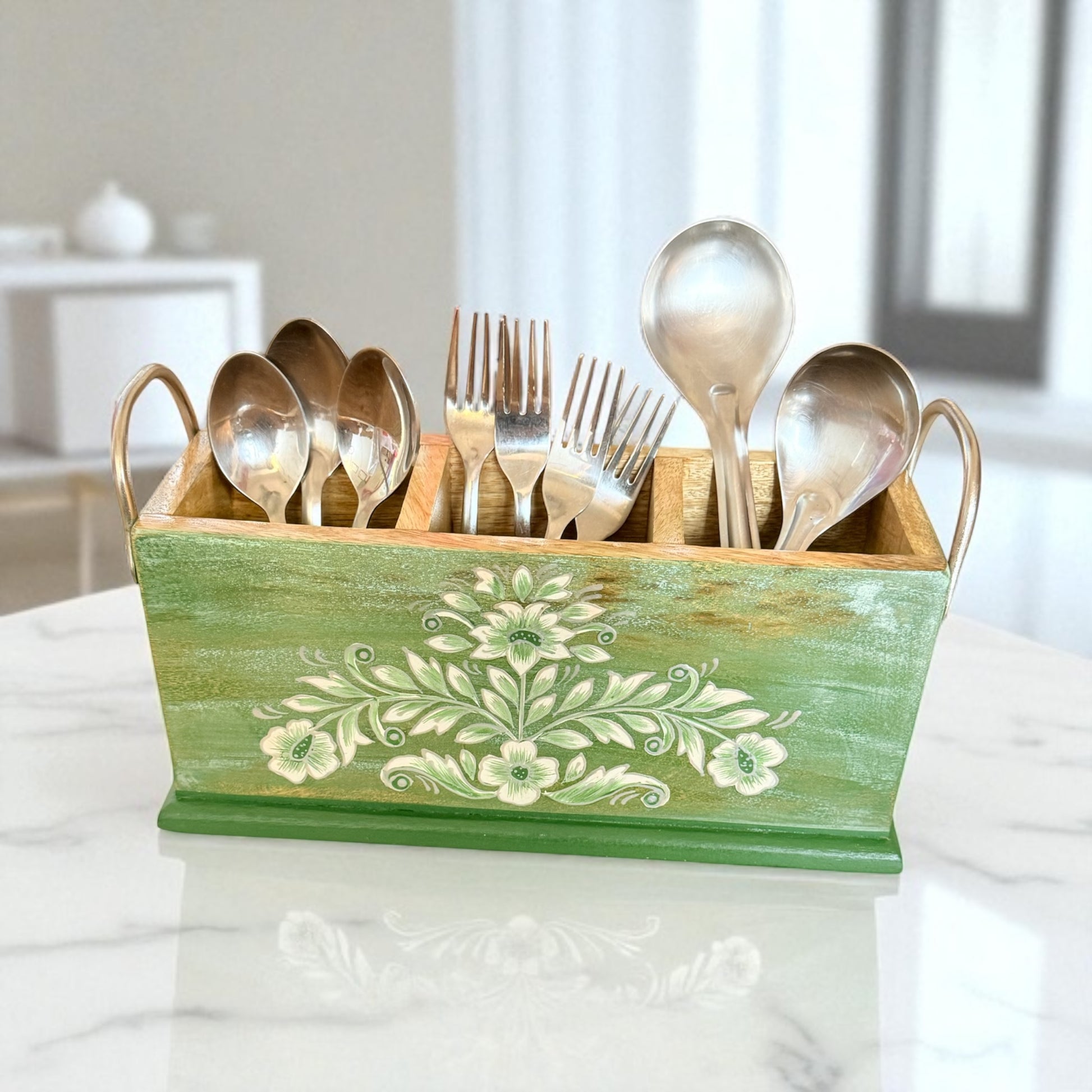 A tribute to nature, the Gulzar Handpainted Leaf Cutlery Holder blends earthy elegance with everyday utility. Handcrafted from sturdy mango wood and adorned with delicate, handpainted Floral patterns, this 3-compartment holder is perfect for organizing cutlery, teaspoons, or even art supplies — while adding a touch of green charm to your space.